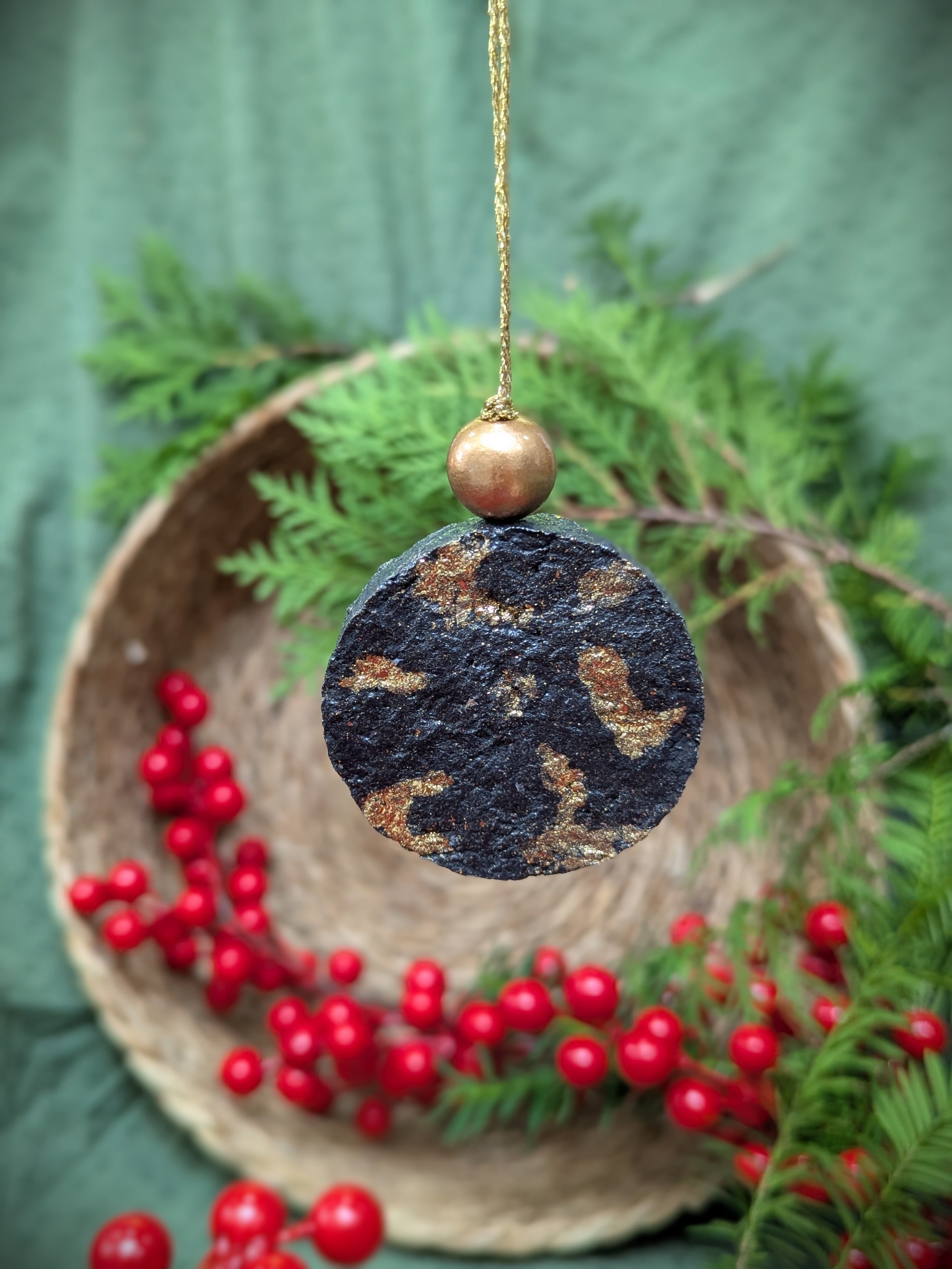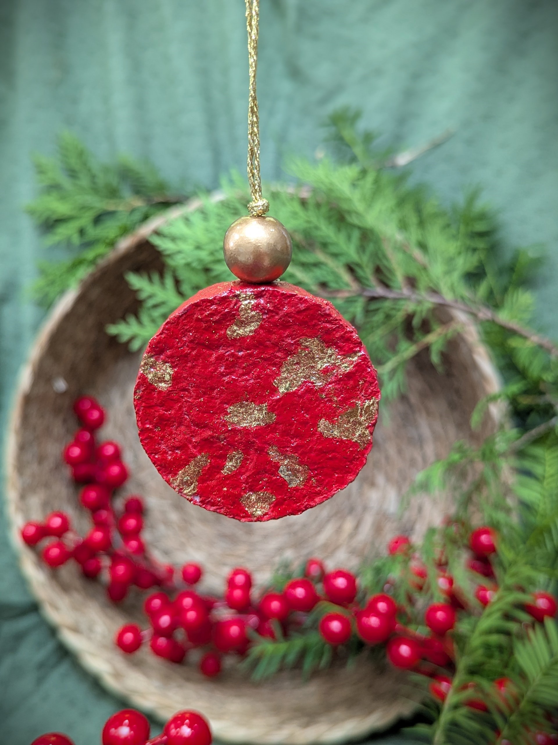 Topped with a gold-painted wooden bead and hanging from a gold thread, this ornament blends earthy texture with festive shine, making it perfect for modern, rustic, or minimalist trees. Lightweight and unbreakable, it’s a sustainable choice for homes that value both beauty and intention.