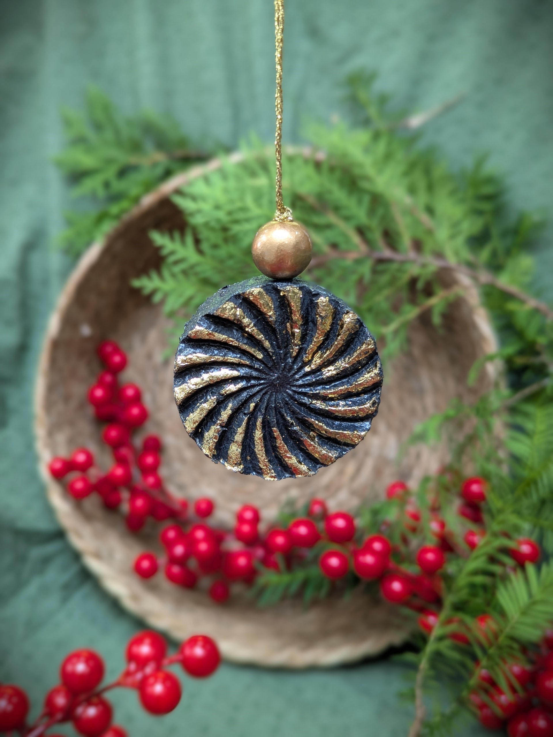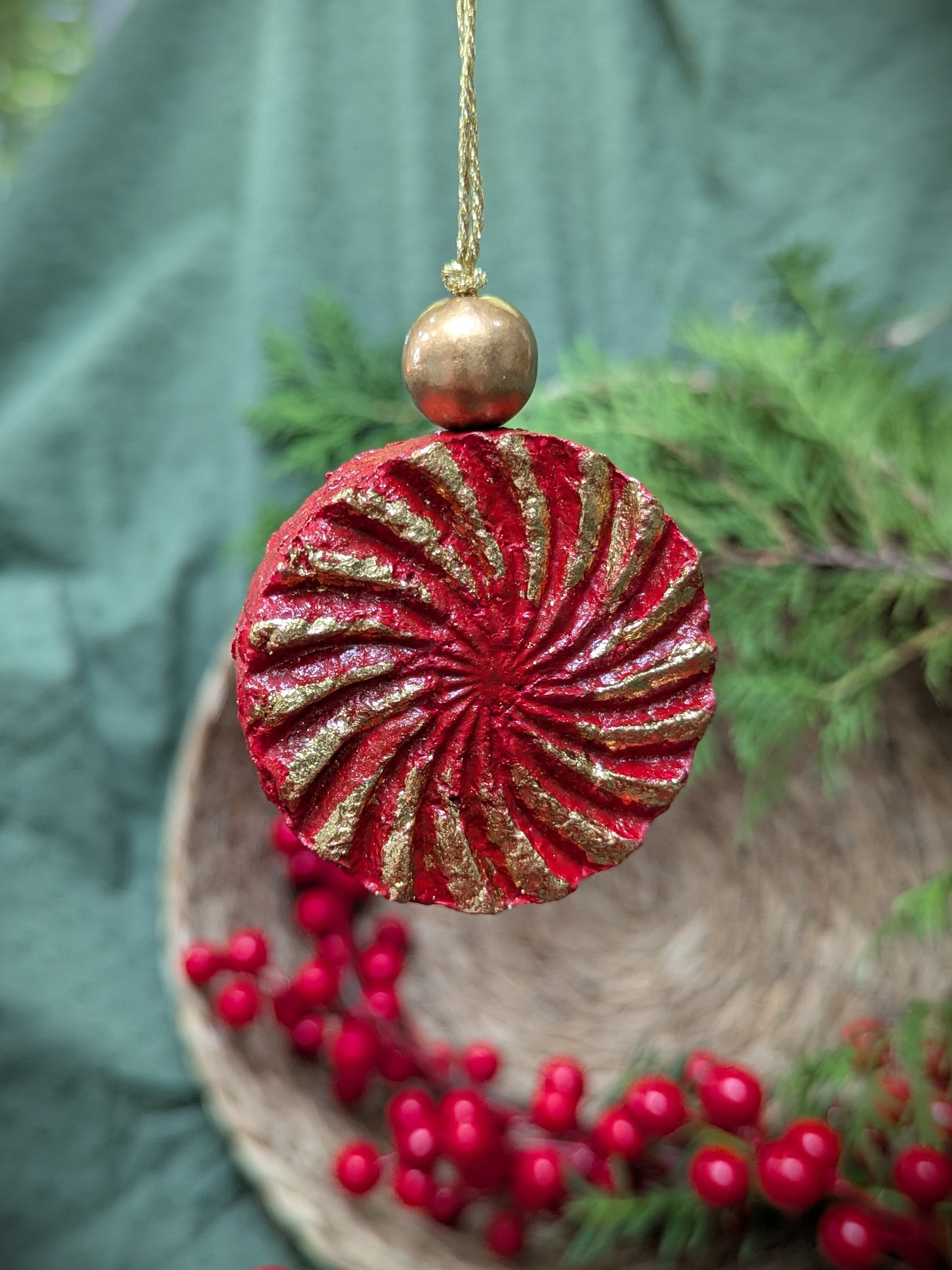 Bring bold elegance to your holiday décor with this hand-sculpted swirl ornament, made from recycled paper pulp and painted in deep grey and juicy red with textured gold highlights. The spiral design reflects natural movement — like a pine cone, solar flare, or cosmic swirl — while the shimmering finish adds warmth and sophistication.