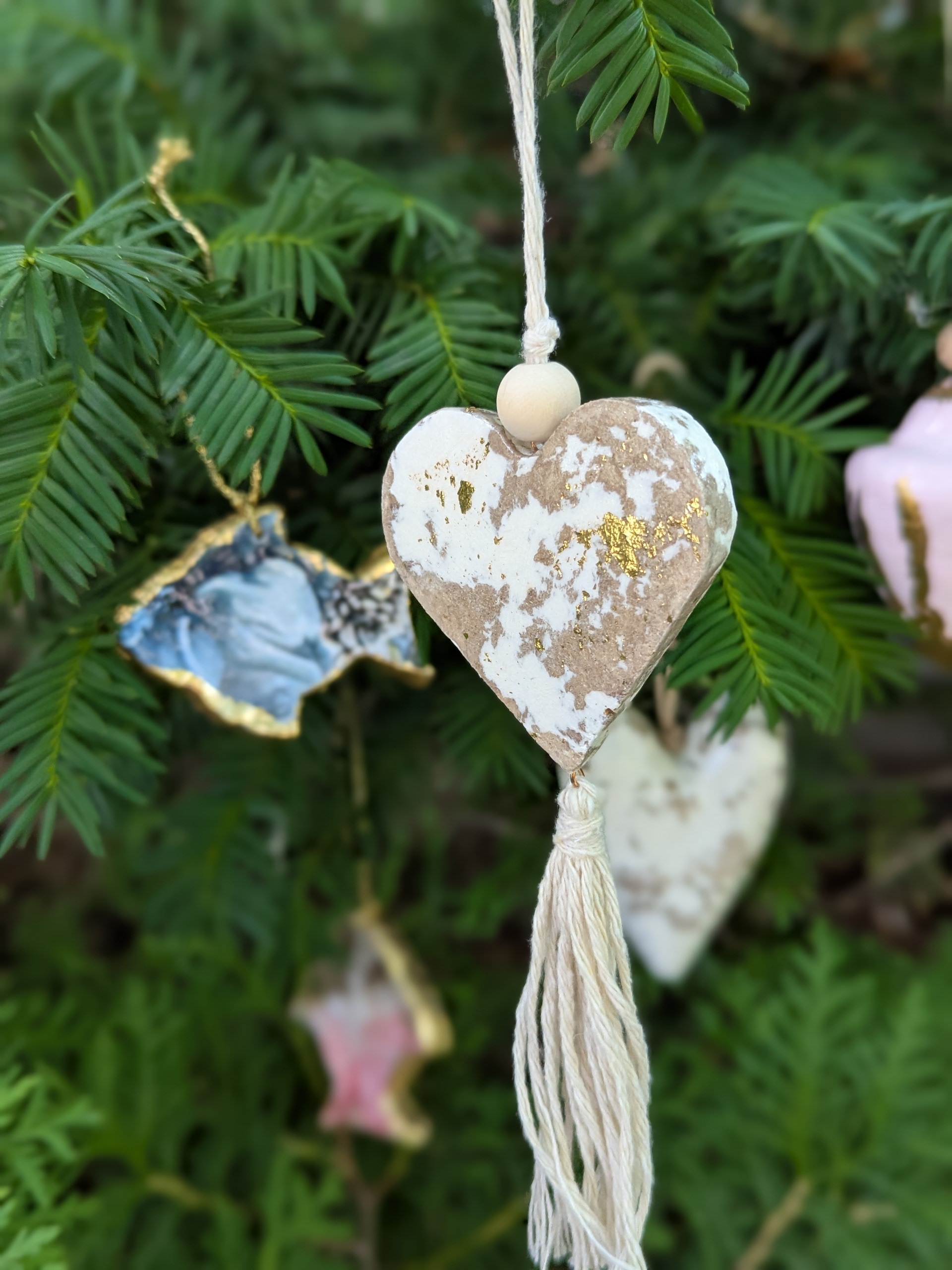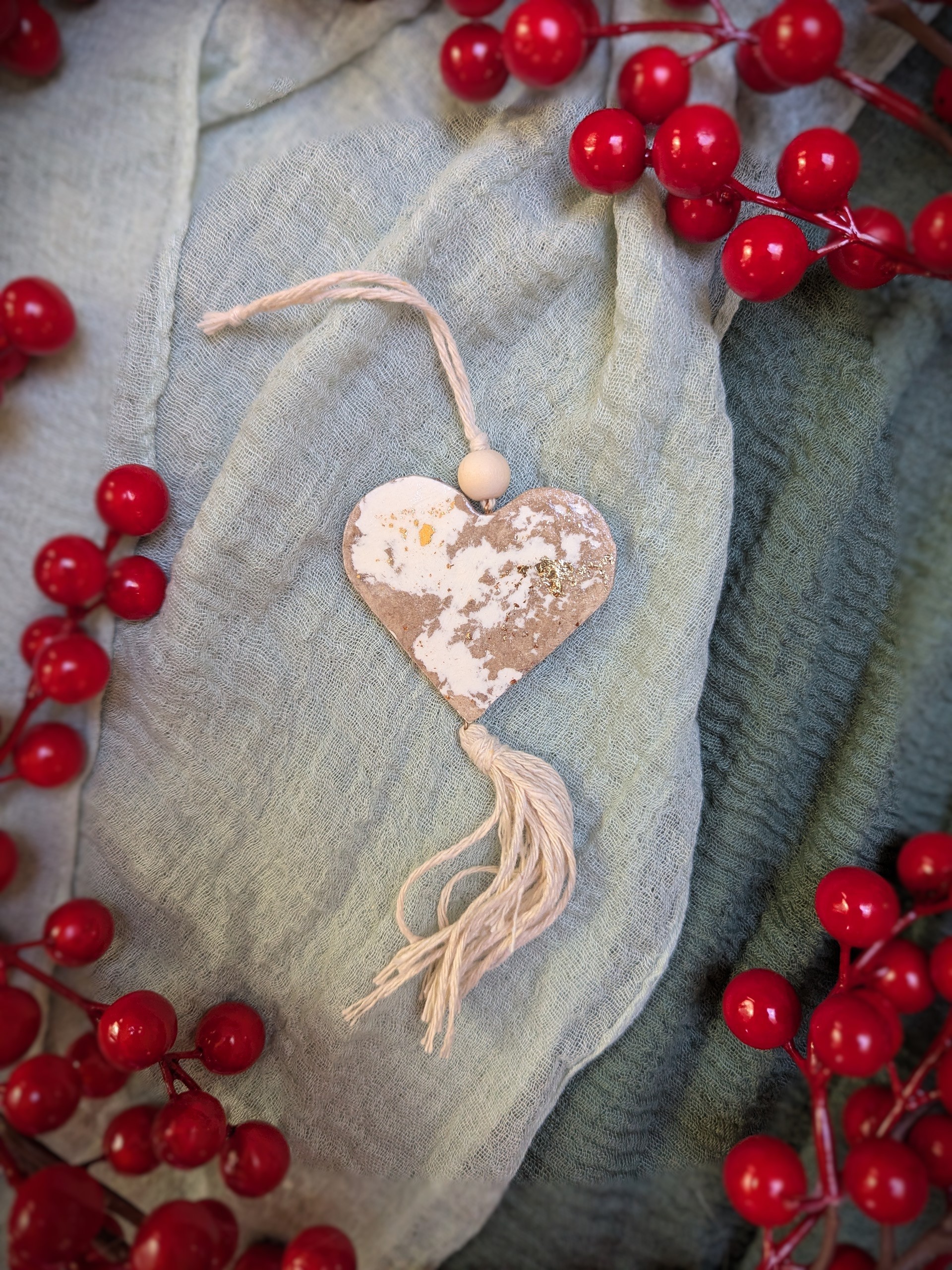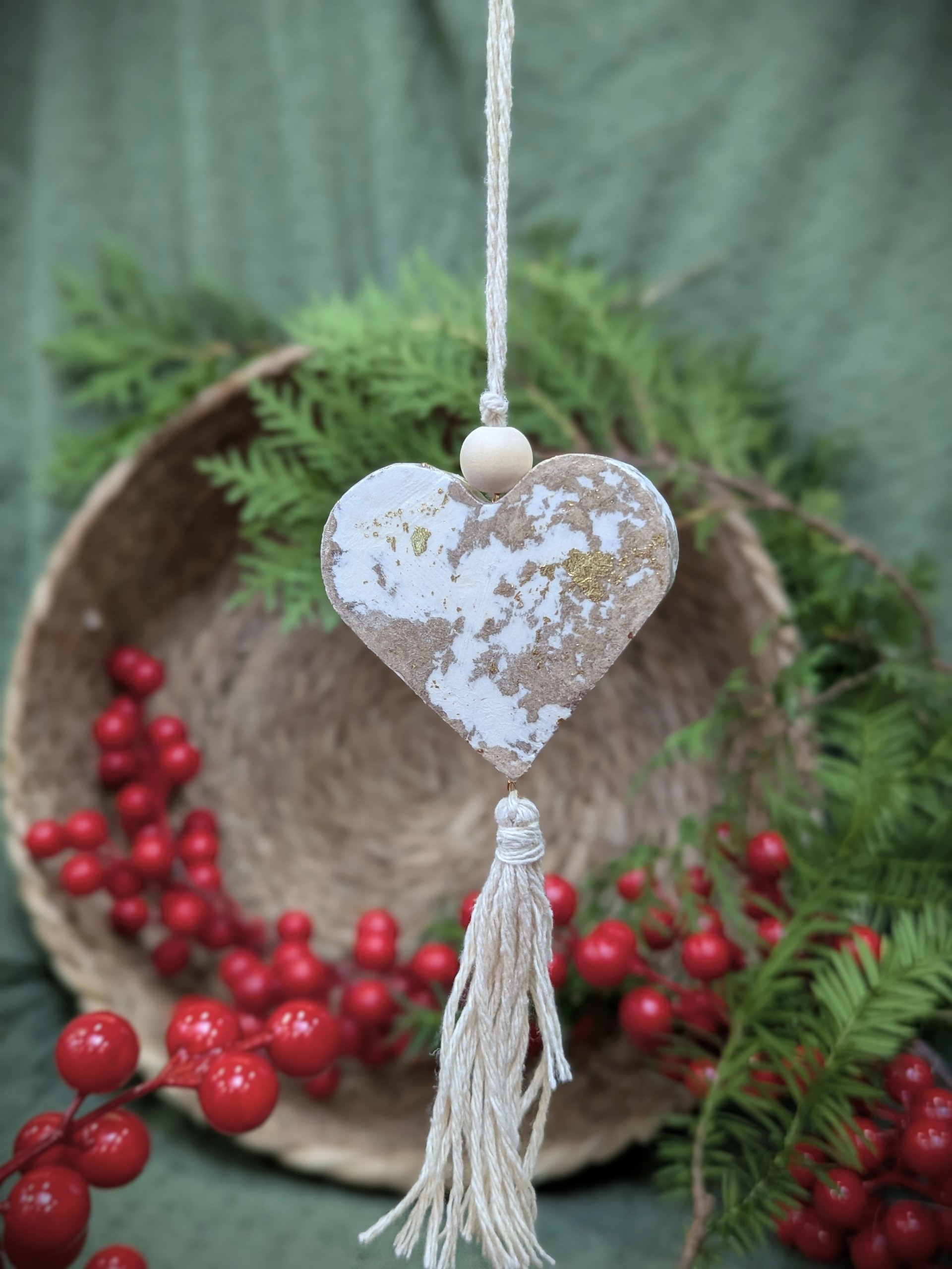 Bring warmth and intention to your decor with this beautifully handcrafted rustic heart ornament. Made from recycled paper, each heart features a unique distressed white and gold finish, giving it an elegant yet earthy appeal. A wooden bead and soft cotton tassel complete the boho-inspired look, making it a versatile piece for both holiday and year-round decor.
